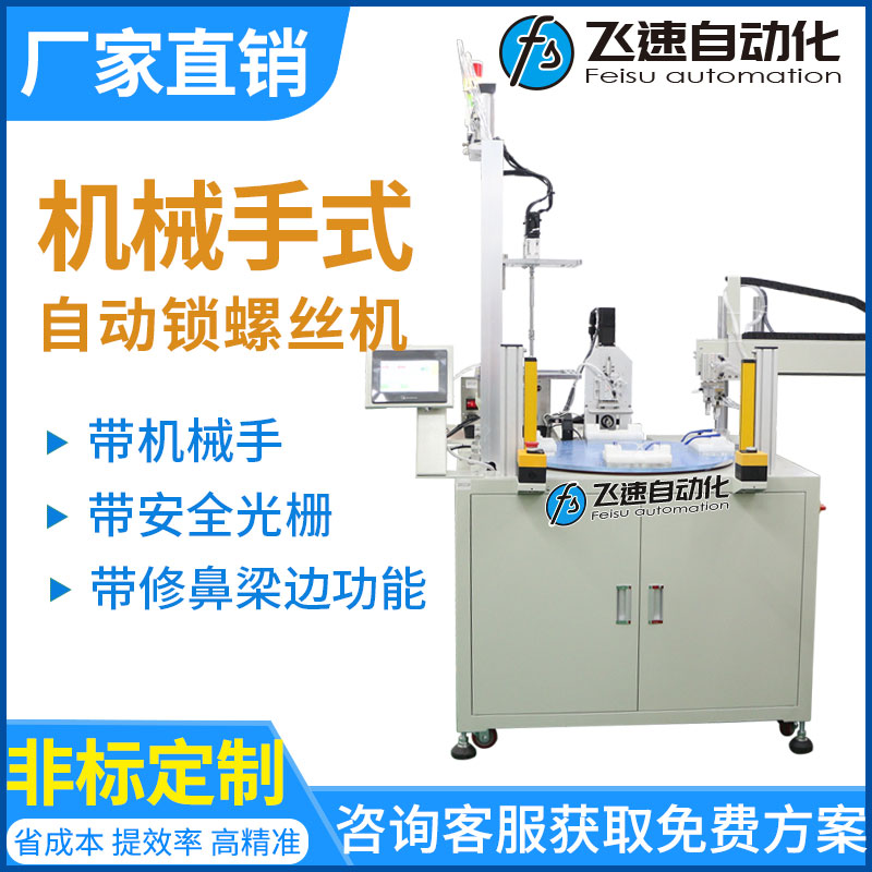 轉盤機械手式擰螺絲機優點: 省人工,流水線專用,配置機械手和轉盤,實現供料、檢測、鎖付、取放產品同步作業,并由設備自動完成,節省大量人工;