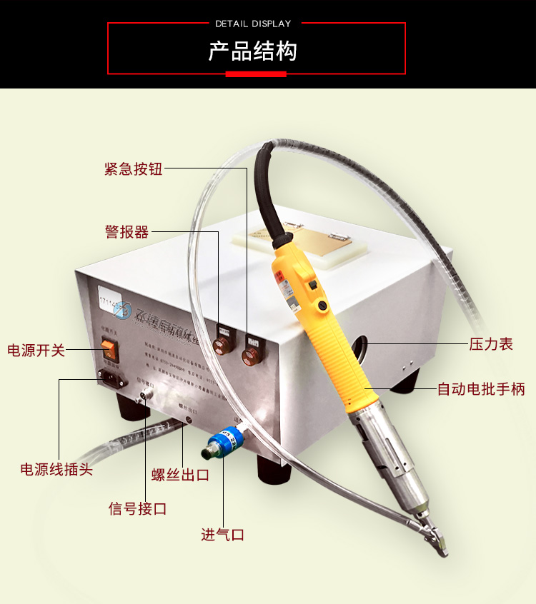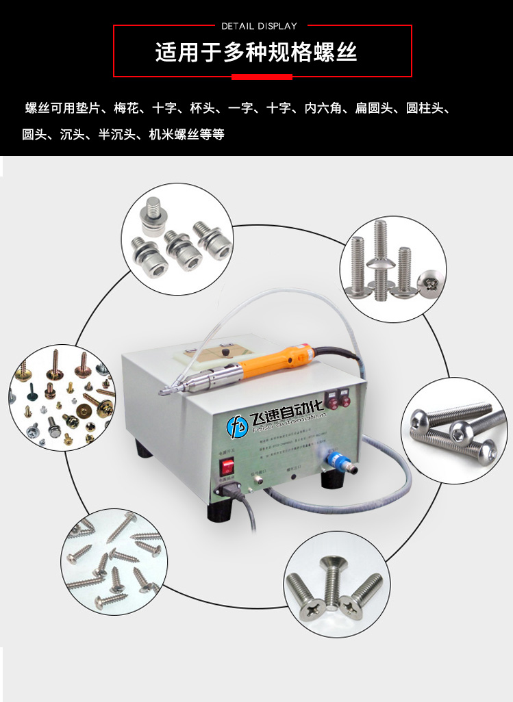 - 產(chǎn)品簡介: 手持式自動打螺絲機也叫自動供料鎖螺絲機、自動擰螺絲機等,嚴(yán)格來講,手持式只能算是半自動,因為它還是需要手工操作。一臺手持式自動鎖螺絲機主要由兩部分組成:自動供料機和電批,其中自動供料機是重要的,也是復(fù)雜的,它的好壞直接關(guān)系到機器卡不卡料的問題。1.采用渦輪上料,體積和噪音小、重量輕,可存放在工作平臺上,節(jié)省空間; 飛速手持式螺絲機: 1.螺絲自動排列、供料,自動篩選異型螺絲,自動補給空料,無料會自動報警; 2.送料采用感應(yīng)器控制,鎖付完一顆來一顆,自動送料,不會出現(xiàn)重復(fù)給料現(xiàn)象; 3.滑牙不送料:在鎖付工程中,扭力達不到,螺絲不送出,防止批嘴出現(xiàn)卡料現(xiàn)象; 4.穩(wěn)定性好,不卡料,即使不良導(dǎo)致卡料,非專業(yè)人員也可以在幾秒鐘內(nèi)解決卡料; 5.效率高,一般1秒鐘打一個螺絲,不用抓起螺絲,只需對準(zhǔn)螺絲孔位鎖緊螺絲即可; 6.可減少1到2個工人螺絲鎖付作業(yè),實現(xiàn)半自動化生產(chǎn),降低工人的勞動強度,提高生產(chǎn)率; 7.關(guān)鍵部位采用高品質(zhì)五金材料并經(jīng)過特殊處理,電子原器件采用原裝進口,確保設(shè)備零故障。 產(chǎn)品適用范圍 1.適用于各種類型的螺絲,螺絲總長應(yīng)大于1.3倍螺帽直徑; 2.支持深孔螺絲鎖付,孔深小于40mm,M1-M6的螺絲; 3.適用于數(shù)碼、電子、小家電、電源開關(guān)、燈具、LED、玩具等產(chǎn)品。