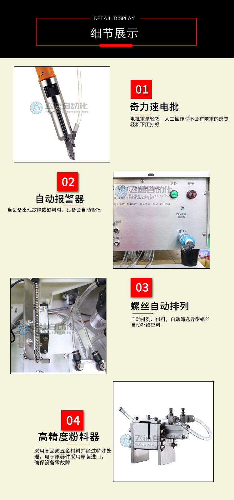 手持式螺絲機使用方法 深圳市飛速自動化設(shè)備有限公司專注自動鎖螺絲設(shè)備生產(chǎn)設(shè)計,擁有臺灣進口CNC、自動化數(shù)控設(shè)備、鉆床、銑床、線切割、精密自動車床等加工機設(shè)備50多臺套,是一家集方案設(shè)計、研發(fā)、制造、加工為一體的實力生產(chǎn)商。近年來為適應(yīng)企業(yè)自動化生產(chǎn)需求,公司研發(fā)多種系列自動化鎖螺絲設(shè)備,廣泛用于通信、電子、電器、電腦、燈飾、玩具、建材、汽車等制造業(yè)。 熊先生:13923485762