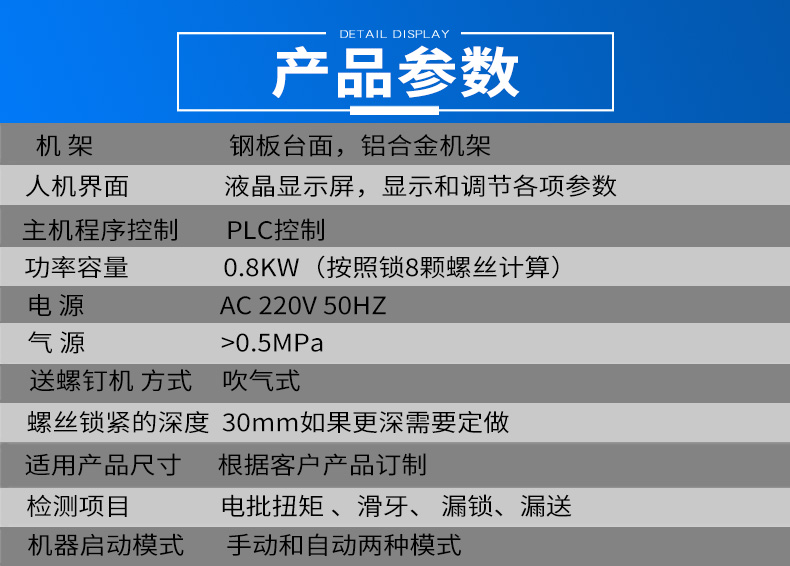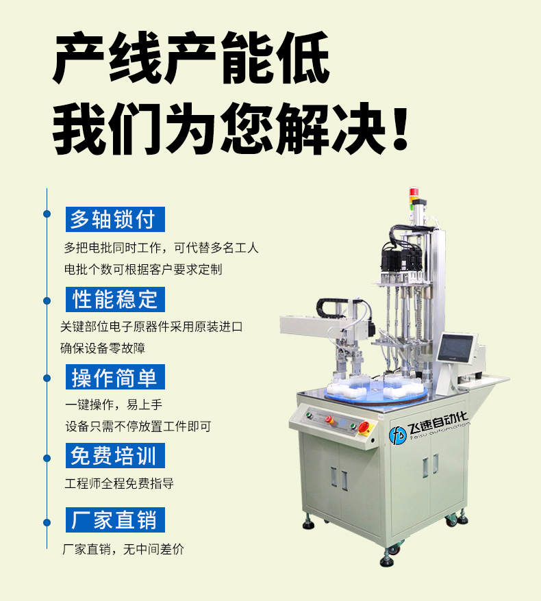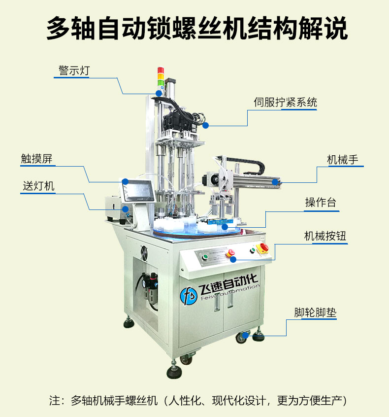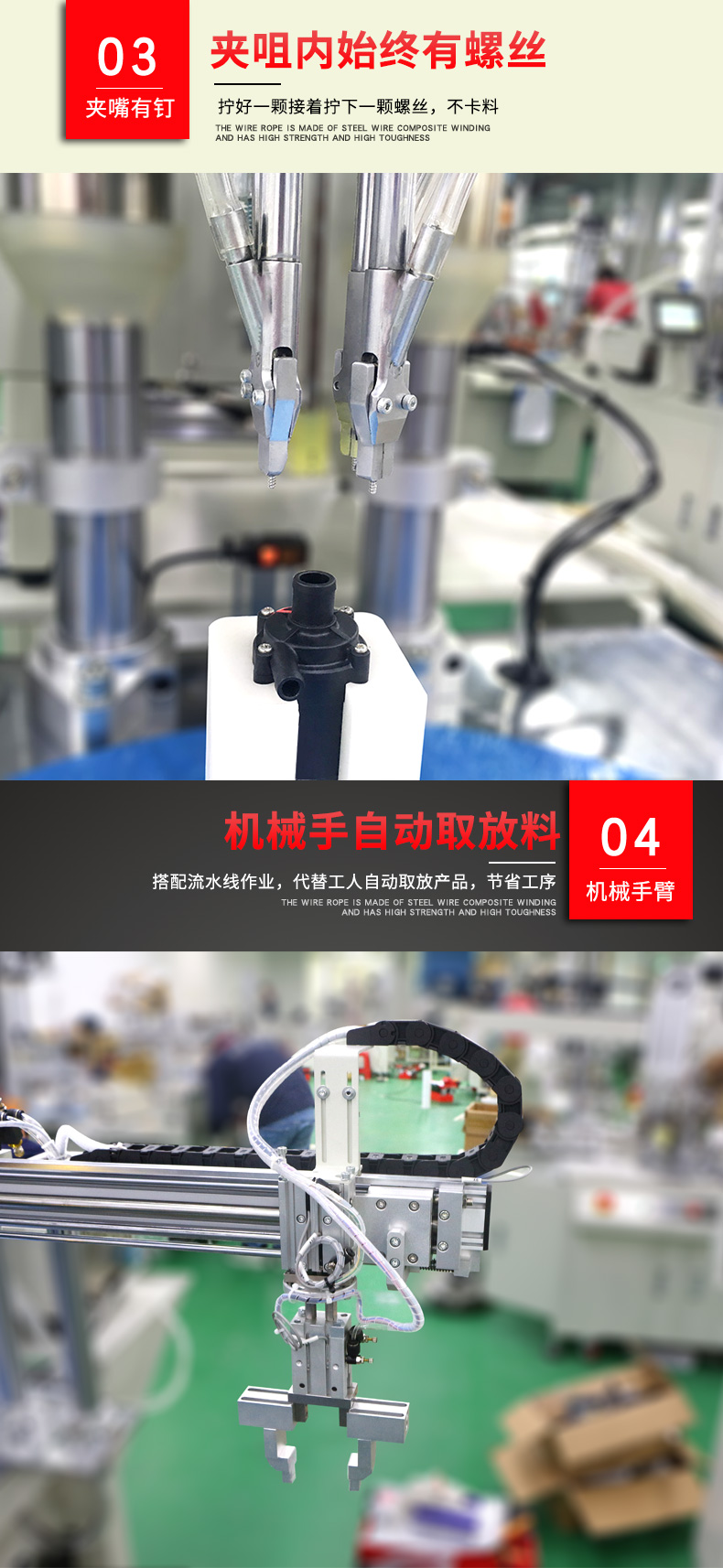 - 產品簡介: 該臺攝像頭自動擰螺絲機,是用來擰攝像頭上面和側面的螺絲。另外根據客戶要求,我們這邊同時搭配了機械臂,通過機械臂將產品轉移至流水線上,方便客戶節省時間,提高客戶生產產能。
